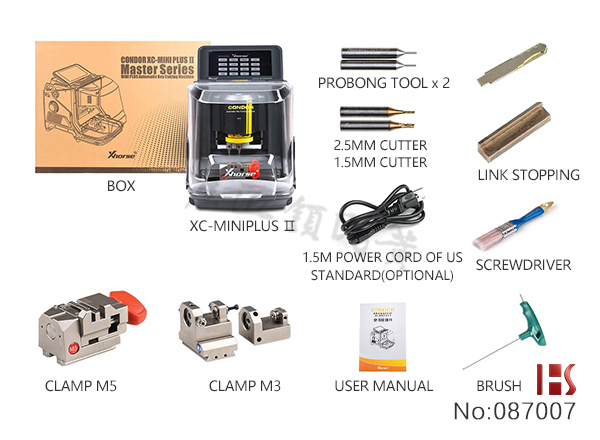 Condor XC-Mini Plus II에는 새로운 M5와 M3 바이스가 있습니다. 부속되어 있는 바이스에 의해, 내홈·외홈·딤플 키·FO21·Citroen SX9·TIBBE등의 다양한 열쇠의 제작이 가능합니다.